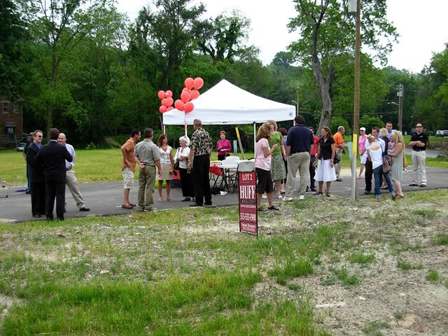 Pictured speakers include Cincinnati Mayor Mark Mallory, Mark Kalb of Revolution Properties (shovel), Andy Holzhauser of the Columbia Tusculum Community Development Corporation (suit), and Susan Rissover of Huff Realty and the website Cincinnati Modern.